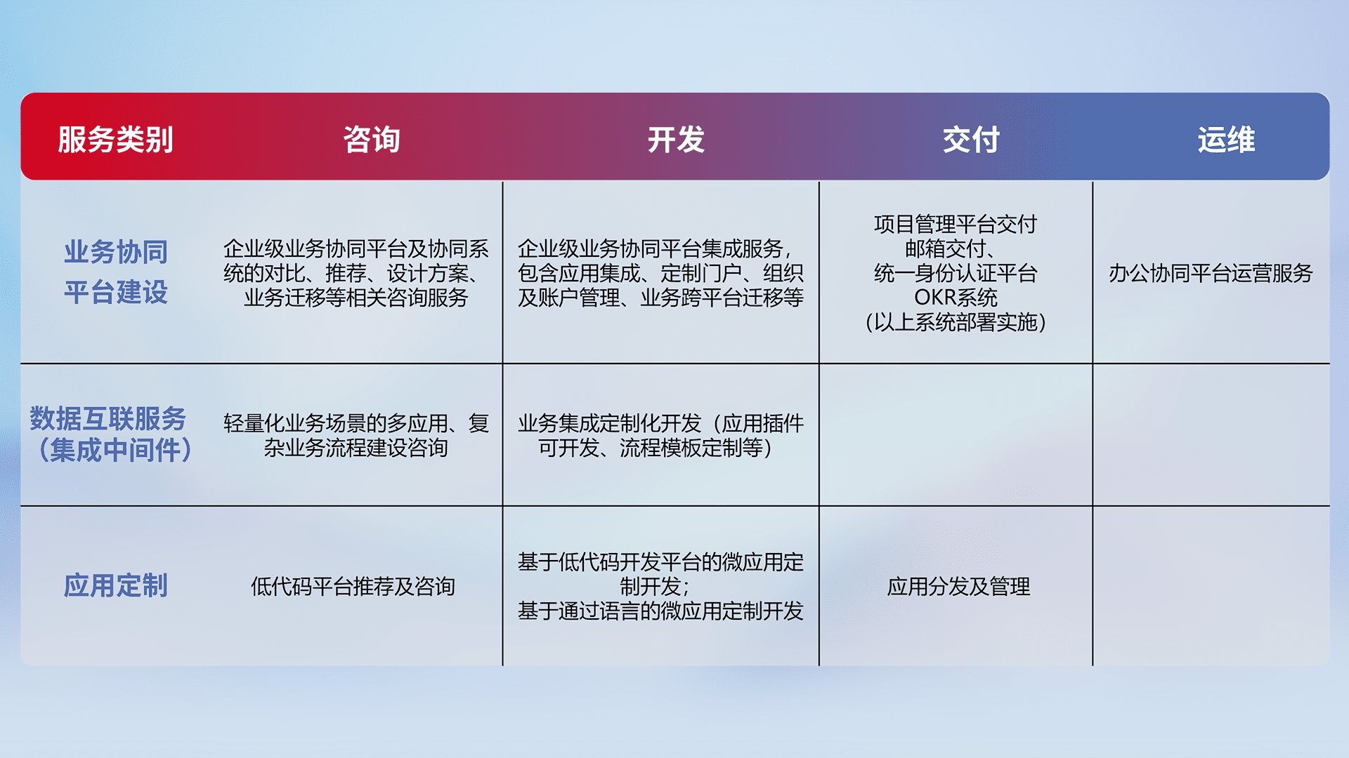 针对钉钉、、企微、、IDaas等平台级产品提供产品的规划、、方案、、、、交付、、定制化开发等服务,,,,实现如统一协同办公、、、、智能客户服务、、、混合会议管理、、智能数据查询、、、、等业务场景,,,实现数字化转型。。。